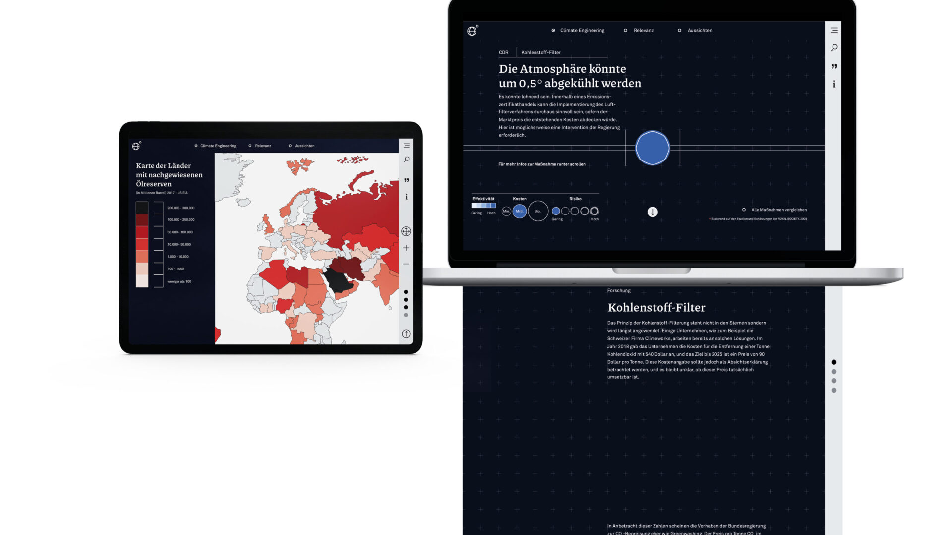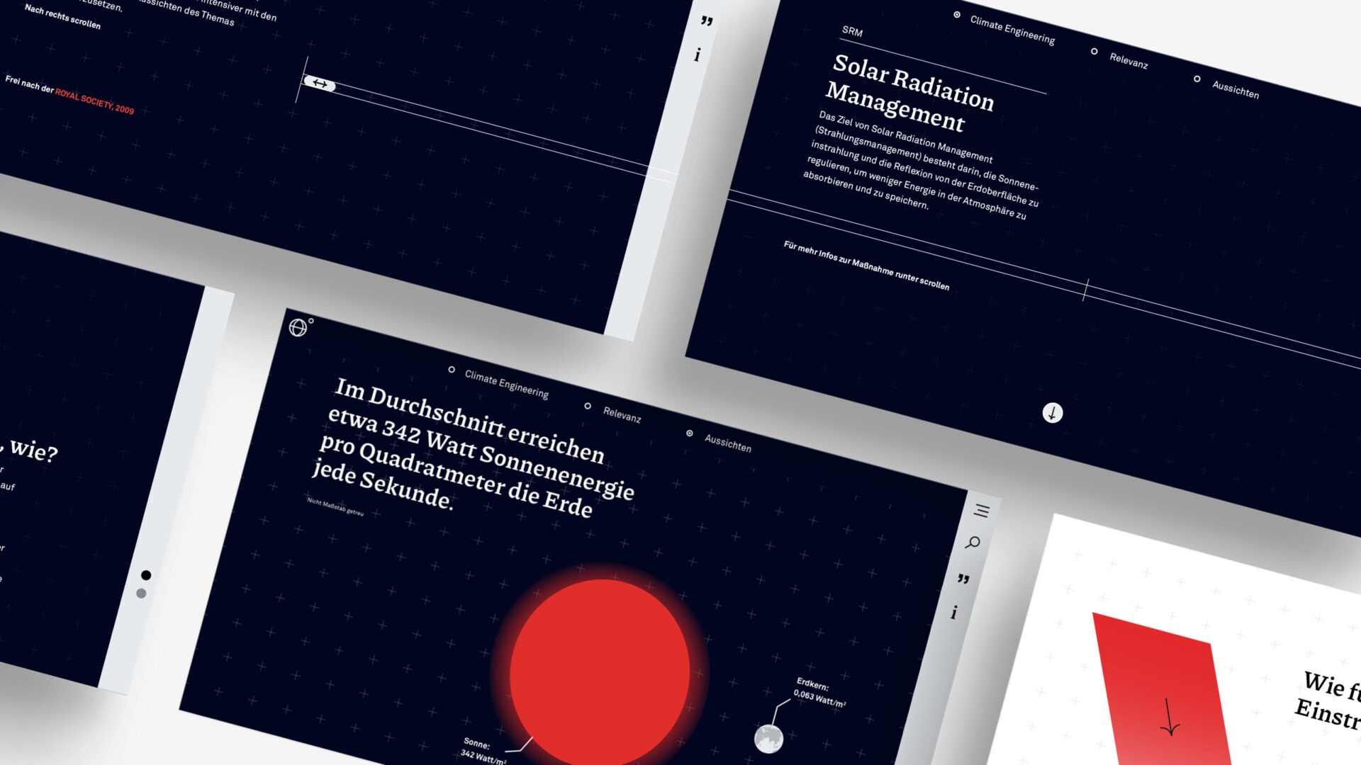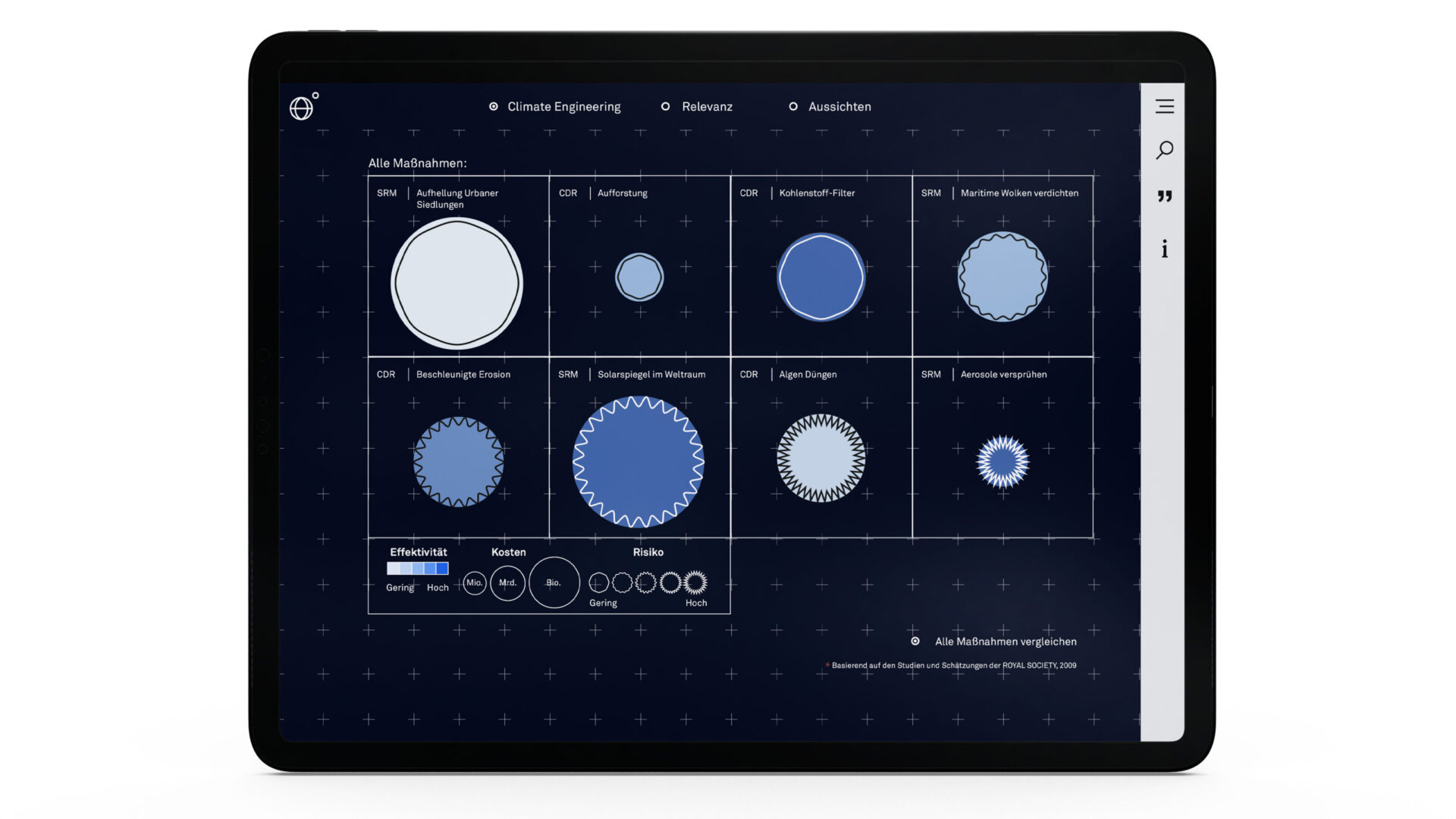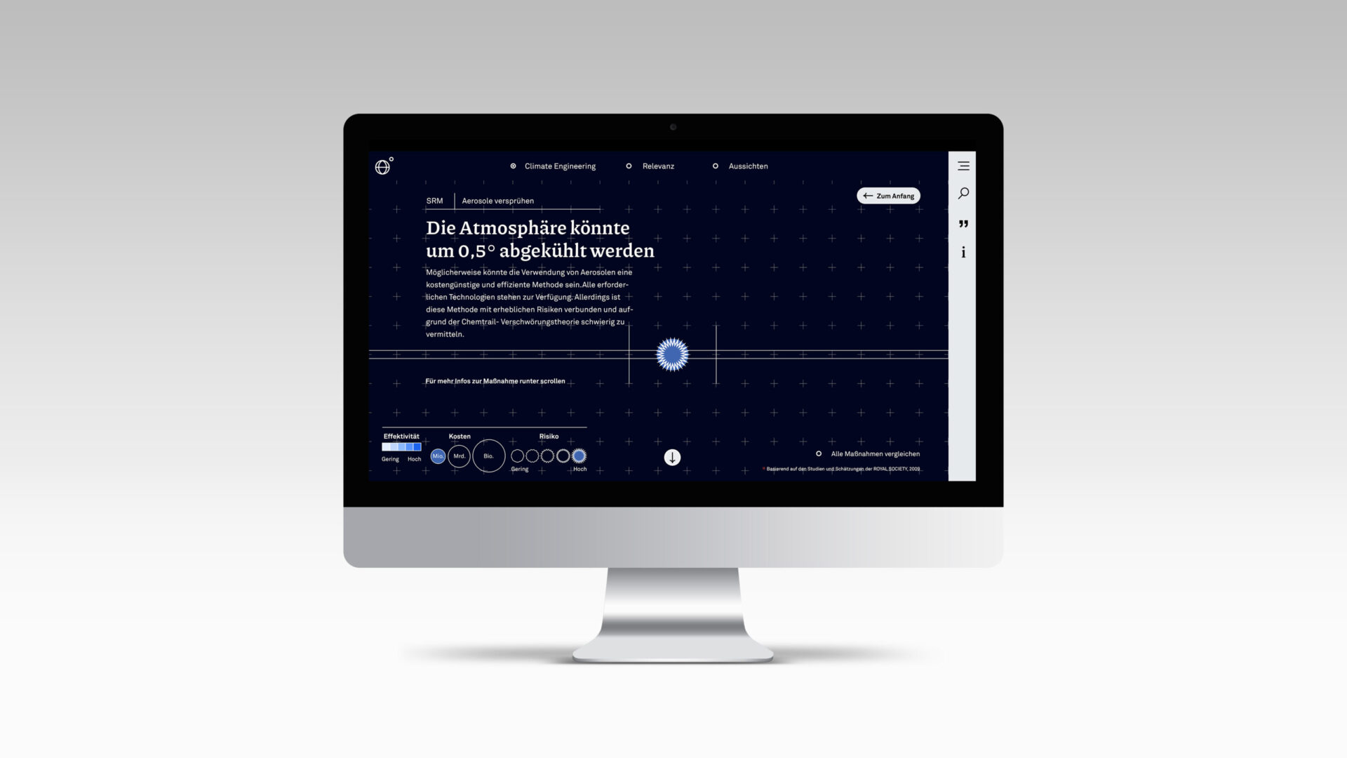 Dieses Projekt hat zum Ziel, umfassend über Climate Engineering-Maßnahmen zu informieren und dabei insbesondere ihre Funktionsweise, Kosten und Risiken darzustellen. Die entstandene Plattform „Die Erde abkühlen!“ bietet einen Einblick in die Lösungsansätze des Climate Engineerings durch die Verwendung von Storytelling. Sie ermöglicht einen Überblick über den aktuellen Stand der Klimaerwärmung sowie den Vergleich von Climate Engineering-Maßnahmen. Ein entwickeltes Bewertungssystem auf Grundlage der „Royal Society“ sowie interaktive Infografiken geben Nutzern einen umfassenden Einblick.