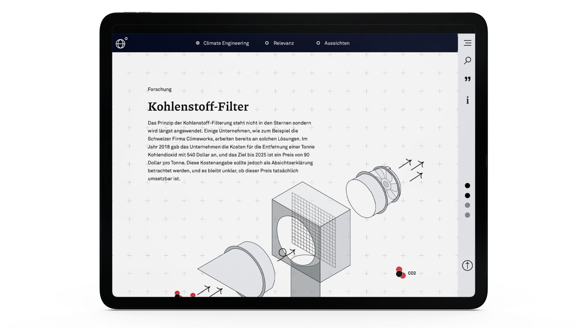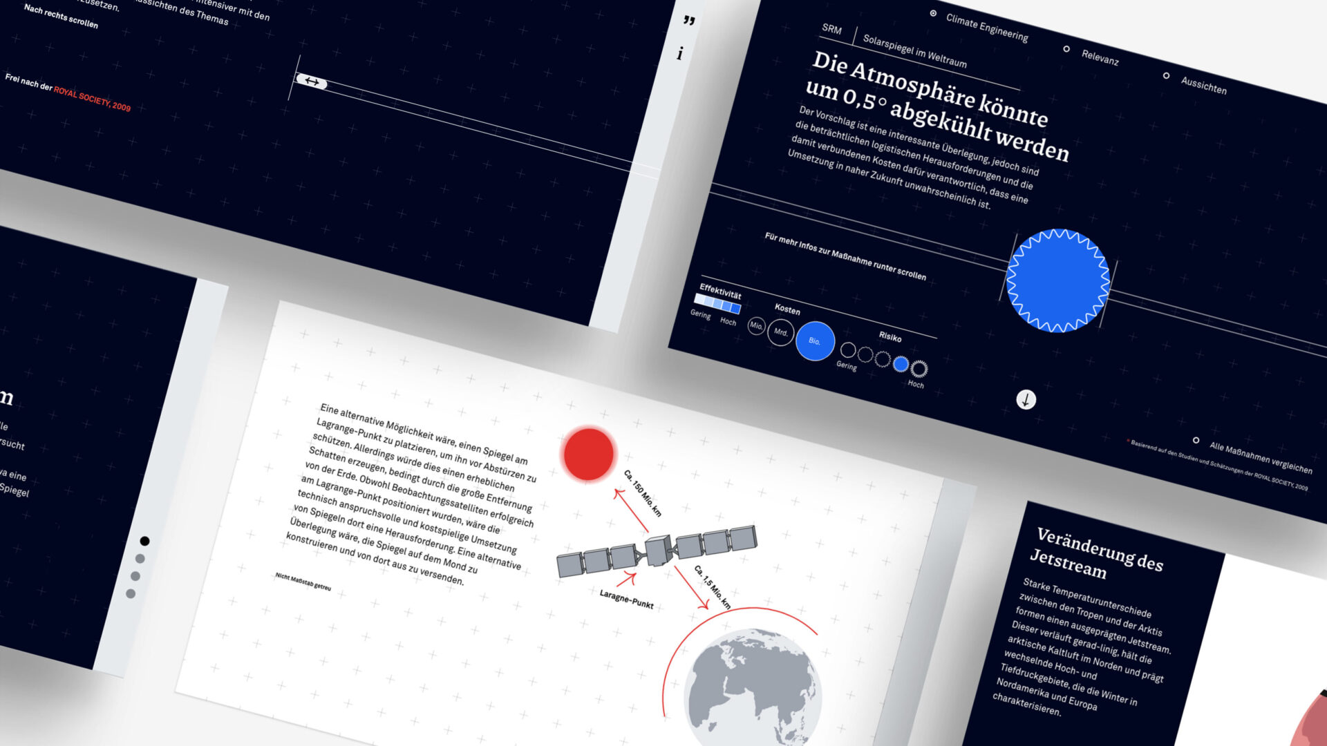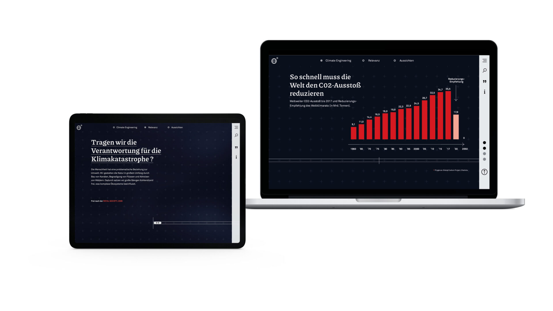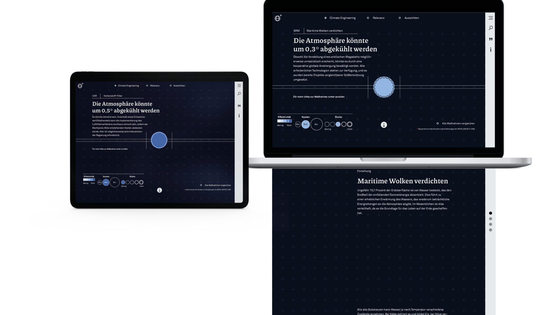 Dieses Projekt hat zum Ziel, umfassend über Climate Engineering-Maßnahmen zu informieren und dabei insbesondere ihre Funktionsweise, Kosten und Risiken darzustellen. Die entstandene Plattform „Die Erde abkühlen!“ bietet einen Einblick in die Lösungsansätze des Climate Engineerings durch die Verwendung von Storytelling. Sie ermöglicht einen Überblick über den aktuellen Stand der Klimaerwärmung sowie den Vergleich von Climate Engineering-Maßnahmen. Ein entwickeltes Bewertungssystem auf Grundlage der „Royal Society“ sowie interaktive Infografiken geben Nutzern einen umfassenden Einblick.